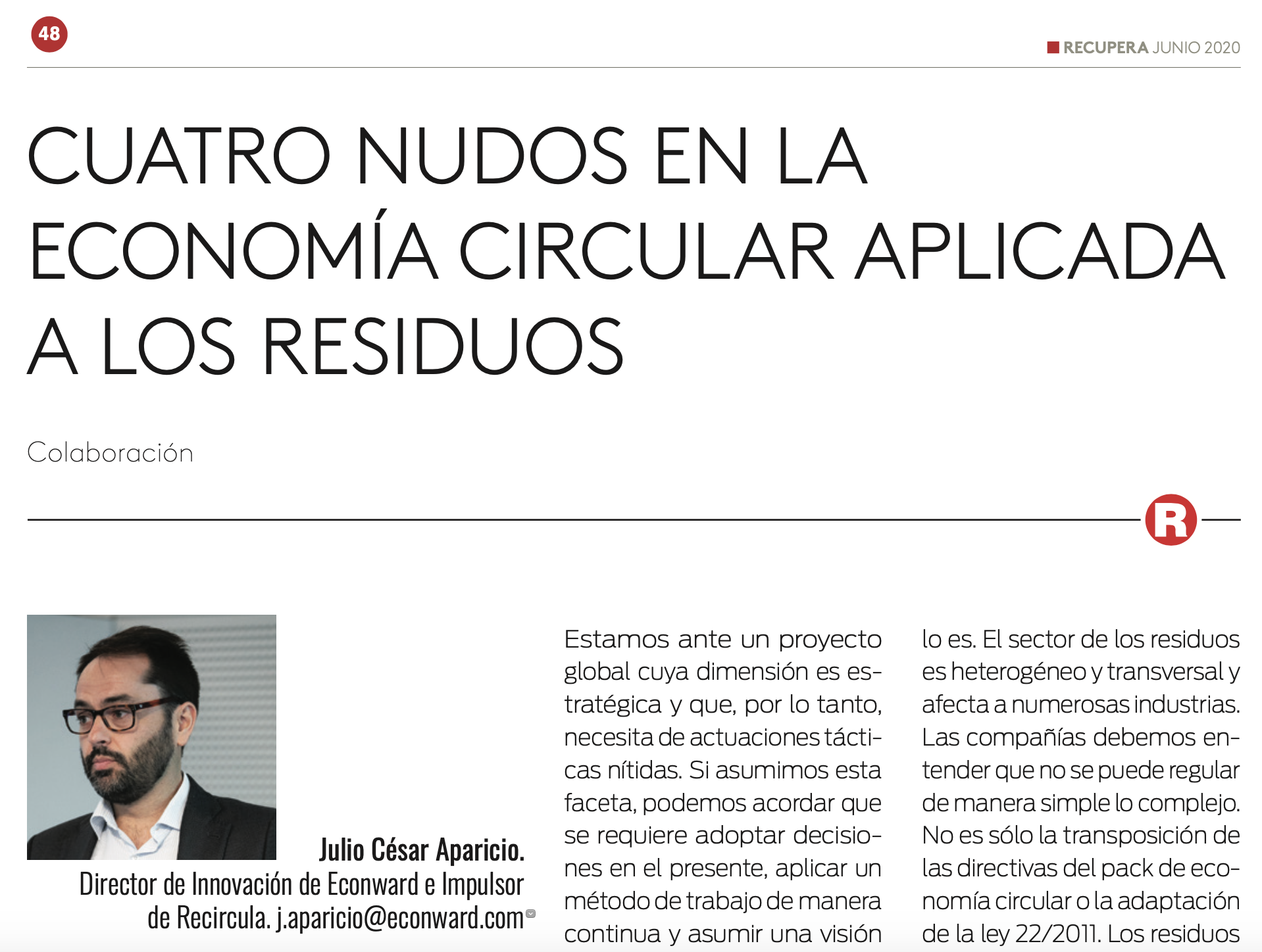 Julio César Aparicio, Director de Innovación de Econward e Impulsor de Recircula, escribe en el número 115 de la revista Recupera.